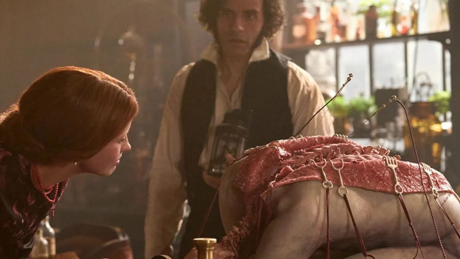 Which brings us to one of the many surprises of the movie: Jacob Elordi as The Creature. I was a little familiar with him before this movie, but not very. I'd seen Saltburn and Pricilla, which were both good movies, and I thought he was excellent in them, but I wasn't particularly aware of his career in general. This changed that. He was incredible. Watching him play the creature was like an amazing piece of performance art. The way he moved his body and conveyed innocence, endless love, and pain through the extensive makeup was some of the best creature acting I've ever seen. Every time he moved, it was both disjointed and smooth, like a bird, as though his hobbled-together body didn't quite measure up correctly. His eyes had the sweet vulnerability of a child, but the tortured child of a negligent, abusive father. Watching the way Victor (played by a wildly enthusiastic and fascinating Oscar Issac) treats the Creature over the course of the movie was an emotional and healing journey for me.