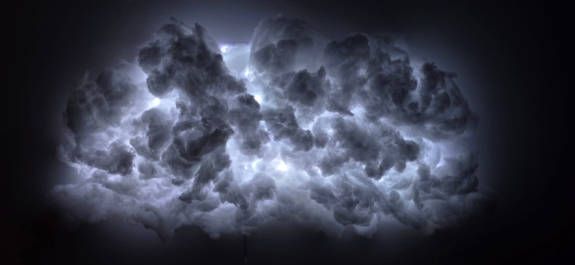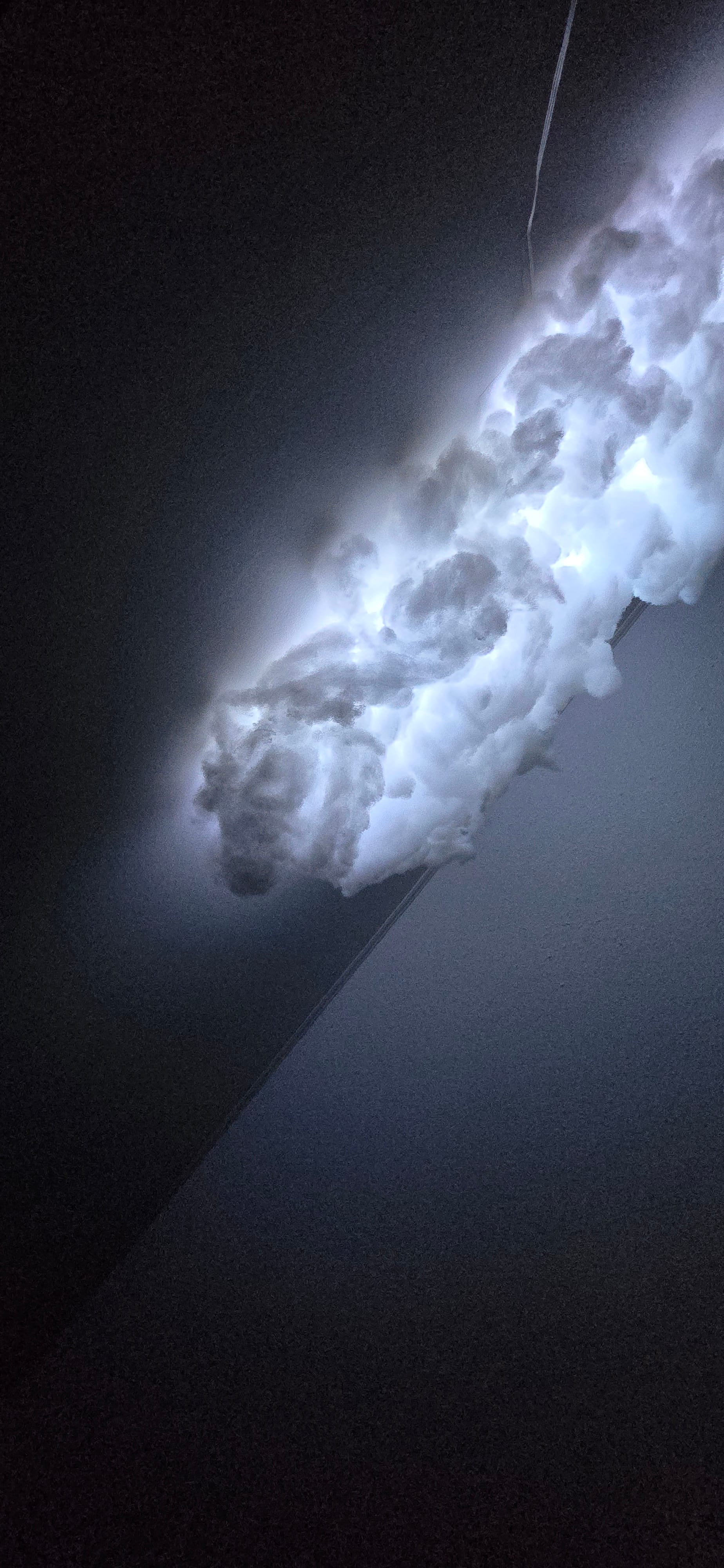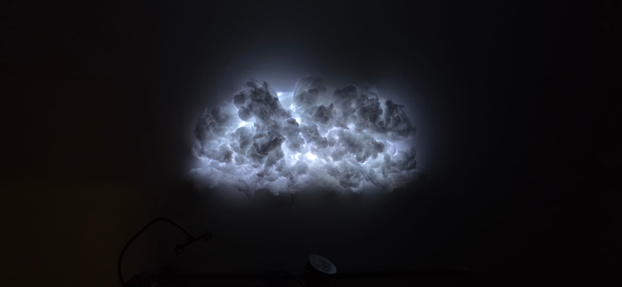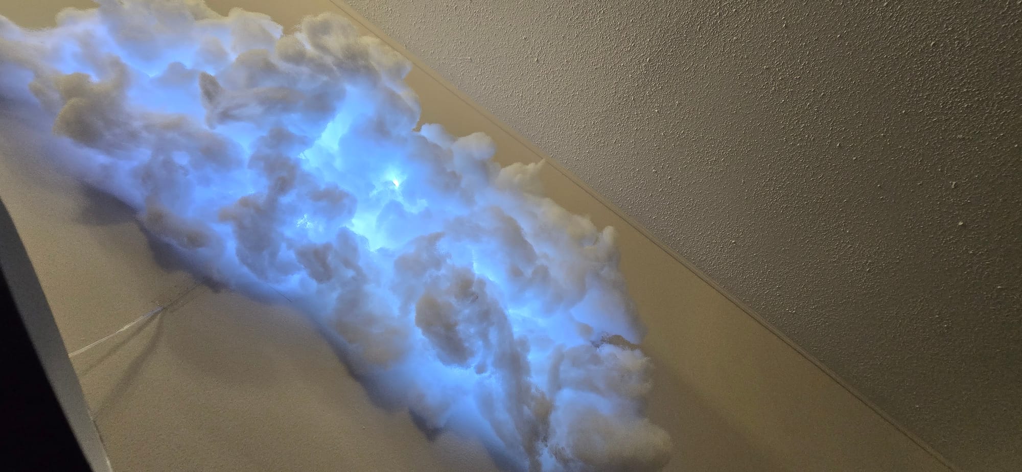 So that's one reason this New Year's Eve has been good. Another reason is that my mom got Sandra this cloud light kit thing for Christmas, and we set that up today over our headboard, and it's really cool. It's basically just a bunch of polyester flossy stuff, like from inside a pillow or stuffed animal, and you glue it to the wall in the shape of a cloud, with a long string of LED lights behind it and pulled through.